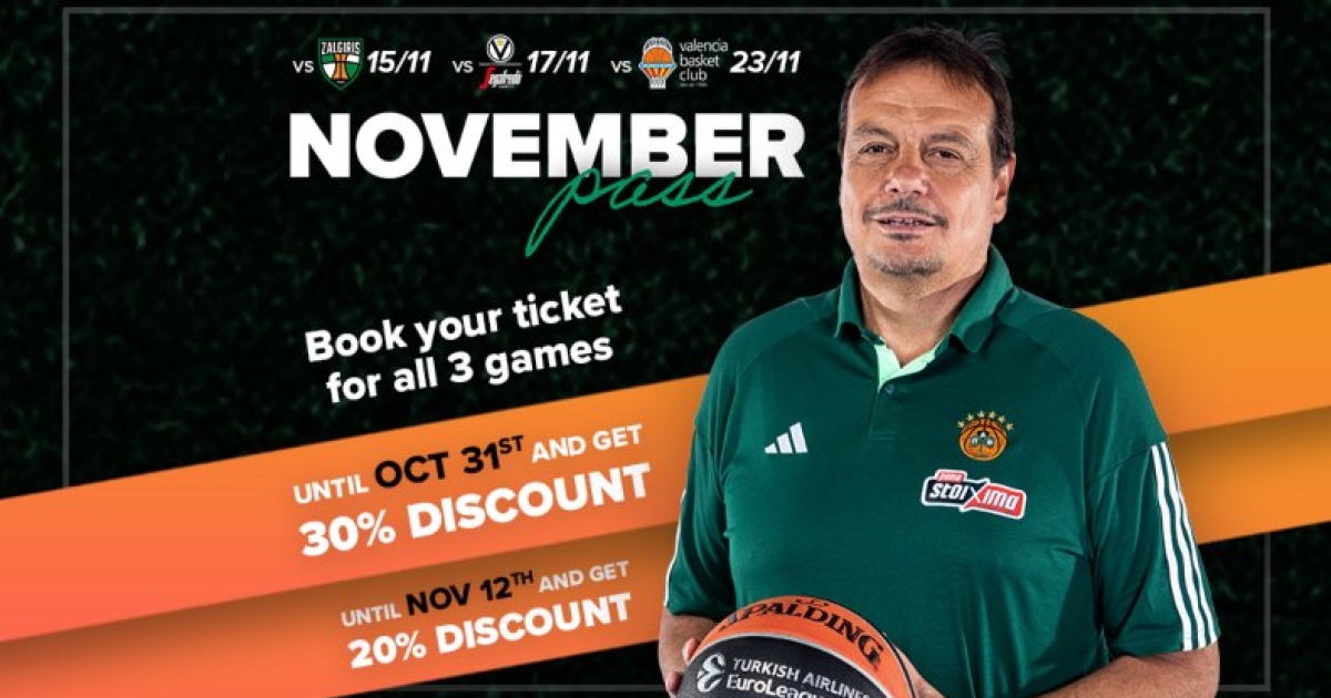 «Η ΚΑΕ Παναθηναϊκός ενημερώνει τους φιλάθλους της πως έθεσε σε κυκλοφορία το November Pass, το οποίο αφορά τις τρεις σημαντικές εντός έδρας αναμετρήσεις για την Euroleague που θα δώσει η ομάδα μας τον μήνα Νοέμβριο.