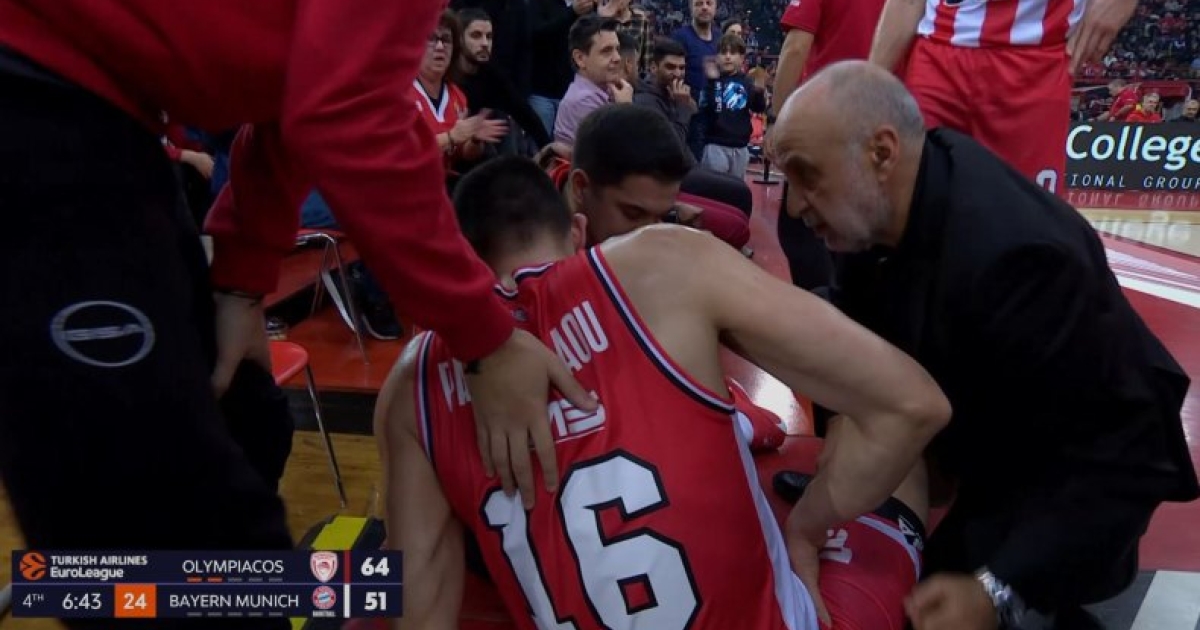 Ο αρχηγός του Ολυμπιακού φάνηκε να δέχεται ένα χτύπημα από το γόνατο του Ντίνο Ράντοντσιτς, όταν ο παίκτης της Μπάγερν επιχείρησε να σκοράρει.