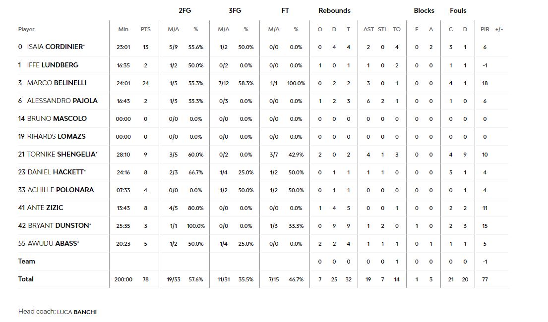 ΠΗΓΕ ΣΤΡΑΦΙ Η ΑΠΟΔΟΣΗ ΤΟΥ: Ο Μάρκο Μπελινέλι ήταν εξαιρετικός έχοντας 21 πόντους με 1/3 δίποντα, 6/11 τρίποντα, 1/1 βολή, 3 ασίστ και 2 ριμπάουντ.