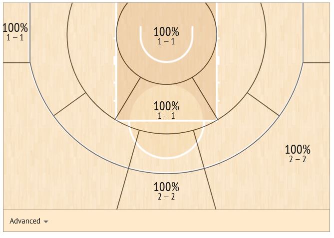 Από αυτά τα σουτ, τα 6/6 έχουν να κάνουν με τζαμπ σουτ, 1/1 με floater και 0/1 layup. Η αγαπημένη του κίνηση είναι το pull-up σουτ με 3/3 σουτ (2/2 τρίποντα, 1/1 δίποντο) ενώ έχει 2/2 τρίποντα από καταστάσεις catch and shoot από ασίστ των Τζέριαν Γκραντ και Χουάντσο Ερνανγκόμεθ.