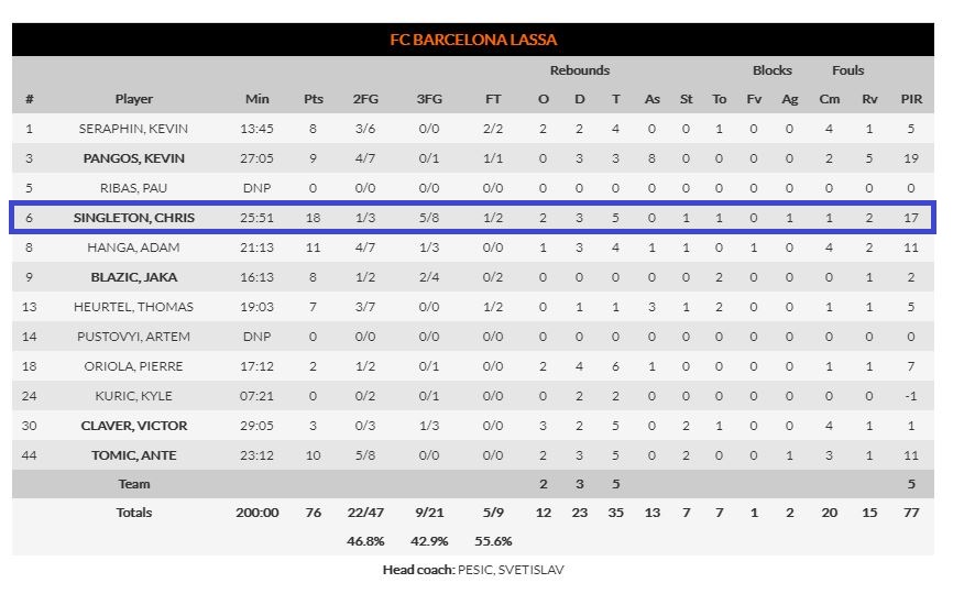 Συγκεκριμένα ισοφάρισε το season high του (όπως και το ρεκόρ στα εύστοχα τρίποντα) και μάλιστα χωρίς να αγωνιστεί ιδιαίτερα στην τελευταία περίοδο. Ο Σίνγκλετον μέτρησε στο ματς 18 πόντους με 1/3 δίποντα, 5/8 τρίποντα, 1/2 βολές, 5 ριμπάουντ, 1 κλέψιμο και 1 λάθος σε 25:51 λεπτά συμμετοχής.