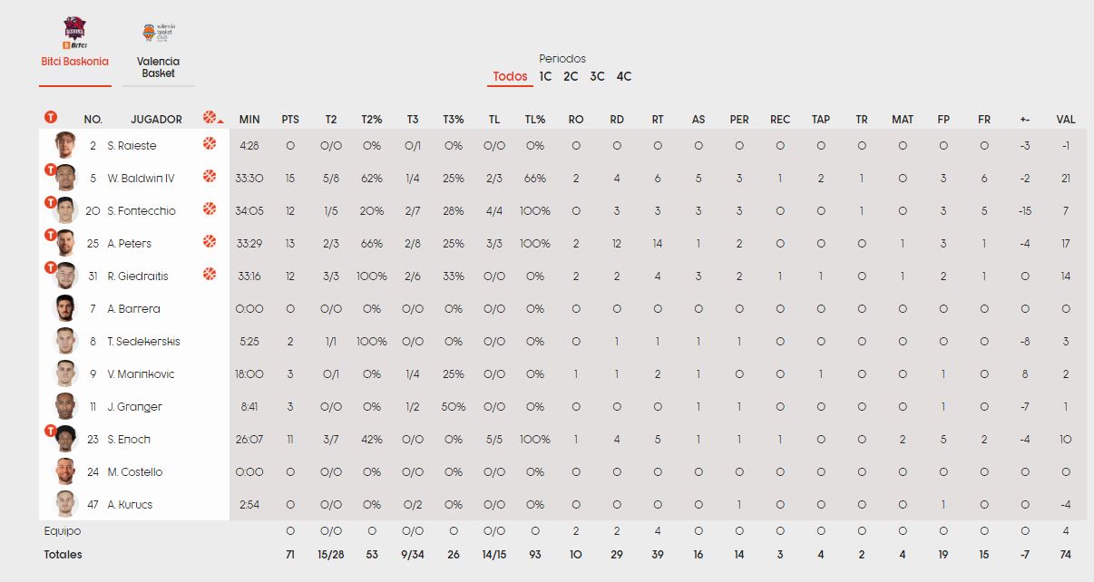Η Βαλένθια στηρίχθηκε στο 22-13 της τελευταίας περιόδου προκειμένου να πάρει τα ηνία του αγώνα και τη νίκη. Για τους Βάσκους, ο Μπόλντγουιν είχε 15 πόντους, 6 ριμπάουντ και 5 τελικές πάσες, ενώ ακολούθησαν οι Πίτερς (13π., 14ριμπ.), Φοντέκιο (12π.) και Γκεντράιτις (12π.)