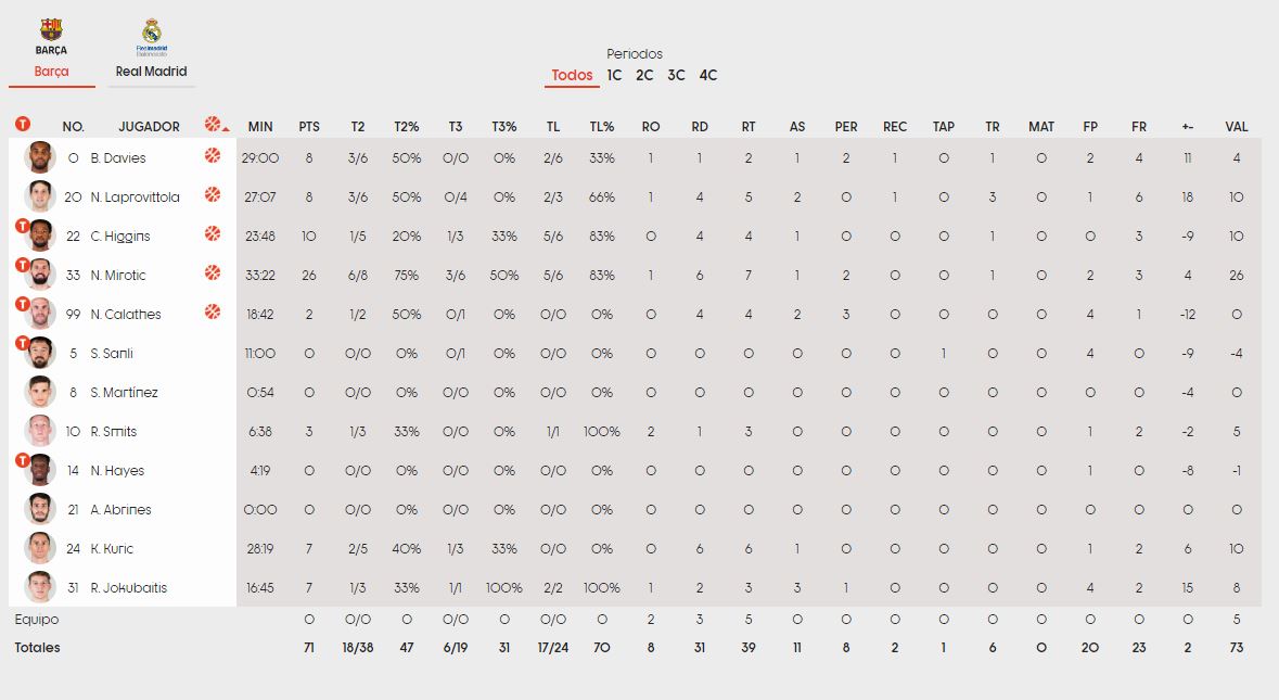 Ο Νίκολα Μίροτιτς ήταν εκείνος που πήρε την κατάσταση στα χέρια του έχοντας 26 πόντους με 6/8 δίποντα, 3/6 τρίποντα, 5/6 βολές και 7 ριμπάουντ, ενώ ο Χίγκινς είχε άλλους 10 πόντους. Από πλευρά Ρεάλ ο Γιαμπουσέλε έκανε τα πάντα (16 πόντοι, 11 ριμπάουντ) ενώ πολύ καλή ήταν και η παρουσία του Ταβάρες (11π.)