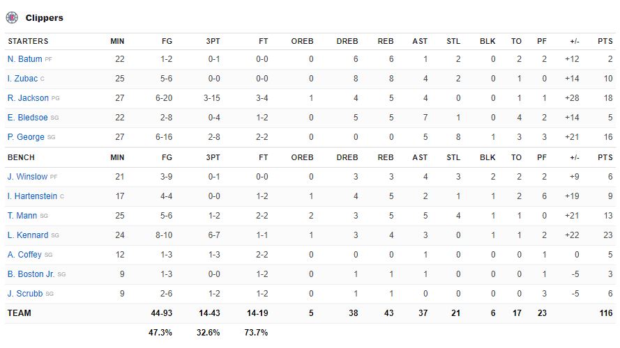 Το τελικό 116-86 αποτυπώνει στο 100% τα όσα συνέβησαν στο Λος Άντζελες! Ο Κέναρντ ήταν ο παίκτης κλειδί ερχόμενος από τον πάγκο, έχοντας 23 πόντους με 2/3 δίποντα, 6/7 τρίποντα (!) και 1/1 βολή, ενώ ο Πολ Τζορτζ μπορεί να είχε 6/16 εντός παιδιάς και 16 πόντους στο σύνολο ωστόσο θα έχει να θυμάται τη συγκεκριμένη βραδιά για τις αμυντικές του επιδόσεις.