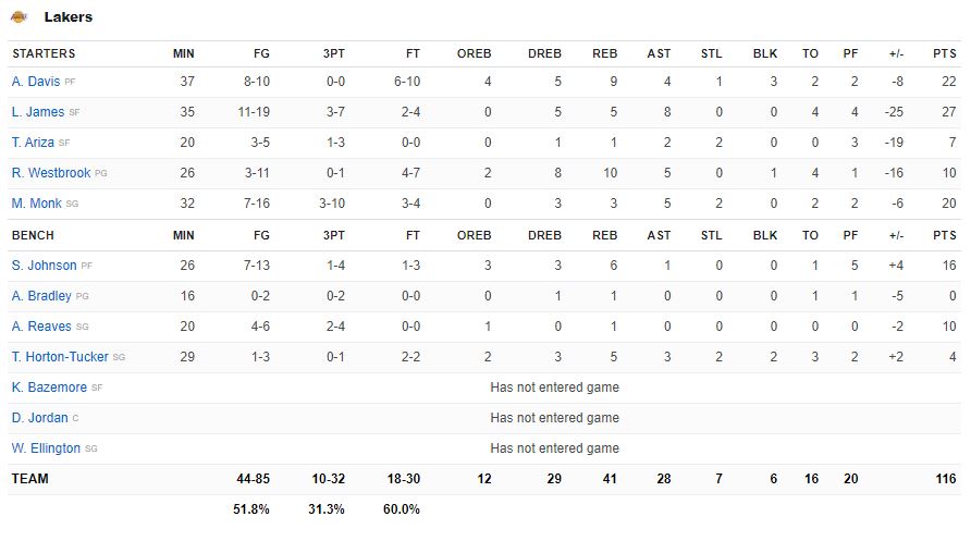 Για τους Λέικερς οι οποίοι βρίσκονται σε πολύ δύσκολη θέση καθώς βρέθηκαν στο 26-29 και απομακρύνθηκαν 4,5 νίκες από την 6η θέση που οδηγεί απευθείας στα playoffs, ο Λεμπρόν Τζέιμς σημείωσε 27 πόντους έχοντας 11/19 εντός παιδιάς, 8 ασίστ και 5 ριμπάουντ, ενώ οι Άντονι Ντέιβις (22π., 9ριμπ.) και Μαλίκ Μονκ (20π., 7/16 σουτ) ήταν εκείνοι που τον ακολούθησαν. Στο μεταξύ ένα ακόμα άστοχο βράδυ για τον Ουέστμπρουκ (3/11 σουτ), με την ομάδα του Λος Άντζελες να πλησιάζει στους 10 πόντους (118-108) πέντε λεπτά πριν από το τέλος χωρίς ωστόσο να υπάρξει και συνέχεια.