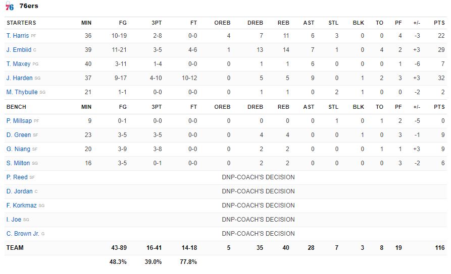 Στον αντίποδα πρώτος σκόρερ για τους 76ers ήταν ο Τζέιμς Χάρντεν με 32 πόντους και 9/17 εντός παιδιάς, ενώ ακολούθησαν οι Εμπίντ (29π., 14ριμπ., 7ασ.) και Τομπάιας Χάρις (22π., 11ριμπ., 6ασ.): «Έχω ακούσει πολλές ομάδες να είναι στην κουβέντα για τον τίτλο εκτός από τους Μπακς. Θα έπρεπε να είναι. Δεν κερδίζουν κατά τύχη» ήταν το κολακευτικό σχόλιο του προπονητή των Σίξερς, Γκλεν Ντοκ Ρίβερς, μετά το τέλος του αγώνα.