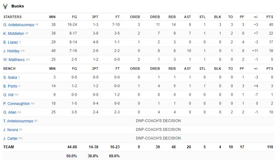 Στο ημίχρονο οι Μπακς είχαν βρεθεί στο -10 (51-61) ενώ δύο λεπτά πριν από το τέλος της 3ης περιόδου (81-89) οι Σίξερς έλεγχαν απόλυτα το ματς με +13 πόντους διαφορά (72-85). Όμως με αντεπίθεση στο 4ο και τελευταίο 12λεπτο, οι Μπακς πραγματοποίησαν επιμέρους 37-27 και μπόρεσαν να φτάσουν σε μια σπουδαία, όσο και σημαντική νίκη. Ο Κρις Μίντλετον ακολούθησε τον Γιάννη Αντετοκούνμπο έχοντας από τη πλευρά του άλλους 22 πόντους (8/17 σουτ) με 9 ριμπάουντ και 7 ασίστ, ενώ «διψήφιοι» για τα «Ελάφια» ήταν επίσης και οι Χόλιντεϊ (18π.), Λόπεζ (17π.)