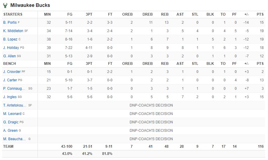 Στον αντίποδα, τα «Ελάφια» δεν μπόρεσαν να κάνουν το 3/3 χωρίς τον Γιάννη Αντετοκούνμπο στο ρόστερ, καθώς ο «Greek Freak» έμεινε και πάλι εκτός αγωνιστικής δράσης. Παρόλα αυτά είχαν την ευκαιρία τους να «καθαρίσουν» το ματς στην 4η περίοδο, αλλά κάποιες βιαστικές επιλογές και κάποια λάθη έφεραν την ανατροπή των γηπεδούχων. Μάλιστα οι Μπακς είχαν επτά παίκτες με διψήφιο αριθμό πόντων αποδεικνύοντας ότι μπορούσαν να φτάσουν σε μια ακόμη νίκη ακόμη και χωρίς τον φυσικό τους ηγέτη.