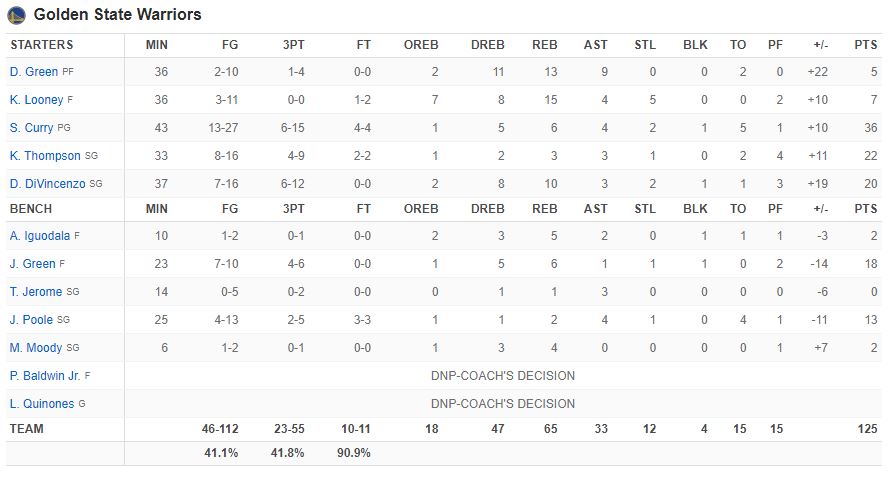 Στο έξτρα πεντάλεπτο οι γηπεδούχοι είχαν το μομέντουμ, τον Στεφ Κάρι να συνεχίζει από εκεί που είχε σταματήσει και κάπως έτσι έφτασαν να προηγούνται και με +7 πόντους (120-113) καθαρίζοντας το παιχνίδι. Ο φυσικός ηγέτης των Γουόριορς είχε 36 πόντους με 7/12 δίποντα, 6/15 τρίποντα, 4/4 βολές, 6 ριμπάουντ, 4 ασίστ, 2 κλεψίματα, 1 τάπα και 5 λάθη σε 43 λεπτά.