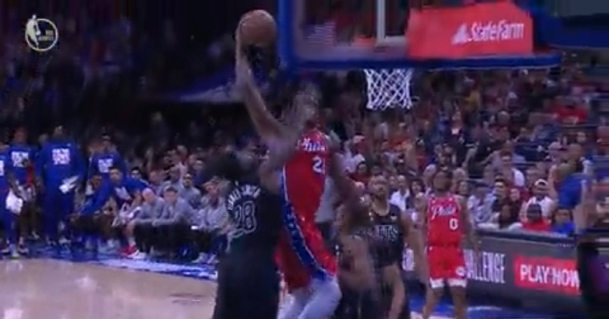 Joel Embiid got hit in the face on this attempted dunk.
