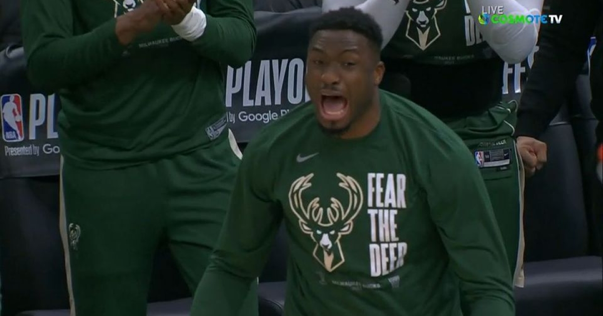 Ο Γιάννης Αντετοκούνμπο τελείωσε με alley oop κάρφωμα μια όμορφη συνεργασία των Μπακς, κάτι που τρέλανε τον Θανάση Αντετοκούνμπο που ήταν στον πάγκο των... ελαφιών.