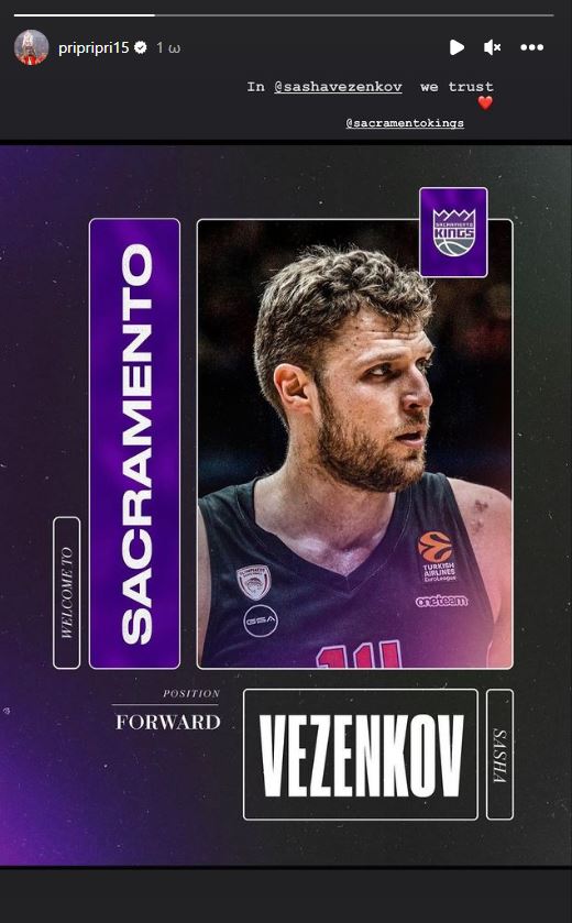 «In Sasha Vezenkov we trust» έγραψε χαρακτηριστικά ο Πρίντεζης σε story του στο Instagram.