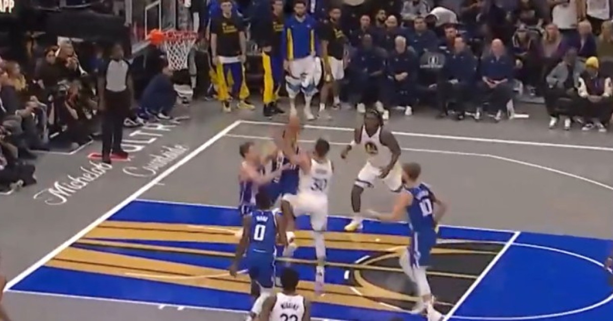 Ο σταρ των Γουόριορς πήγε προς το καλάθι για ένα floater αλλά δεν υπολόγιζε τον Βεζένκοβ που έσπευσε σε βοήθεια για το μπλοκ.