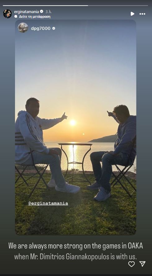 Λίγο αργότερα συναντήθηκε με τον Εργκίν Αταμάν στο Σούνιο όπου έθεσαν επί τάπητος τους στόχους της ομάδας (και) τη νέα σεζόν στέλνοντας μήνυμα για... νέα τρόπαια! Ο Τούρκος τεχνικός προχώρησε σε χαρακτηριστική ανάρτηση αναφορικά με την επιστροφή του ισχυρού άνδρα της ΚΑΕ Παναθηναϊκός AKTOR στο ΟΑΚΑ για τα ματς της Euroleague, γράφοντας σε story.