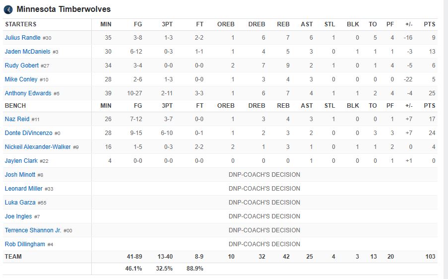Για τους Μινεσότα Τίμπεργουλβς οι οποίοι έχασαν έδαφος για την εξάδα στη Δύση, ο Άντονι Έντουαρντς ήταν ο πρώτος σκόρερ με 25 πόντους αλλά με μόλις 2/11 τρίποντα, ενώ ο Ντόντε Ντι Βιντσέντζο μέτρησε 24 πόντους με 6/10 τρίποντα.