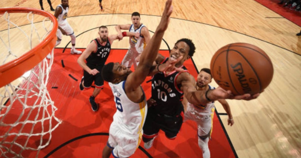 Ο σταρ των Τορόντο Ράπτορς ευστόχησε μπροστά σε... όλη σχεδόν την άμυνα των Γκόλντεν Στέιτ Ουόριορς κερδίζοντας και το φάουλ.
