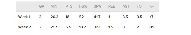 Στα δύο πρώτα ματς που αγωνίστηκε είχε 18 πόντους μέσο όρο σουτάροντας με 41.7% στα τρίποντο. Η δεύτερη εβδομάδα του Τόμας όμως ήταν πολύ κακή με 6.5 πόντους και μόλις 9% πίσω από τη γραμμή των 7.25.