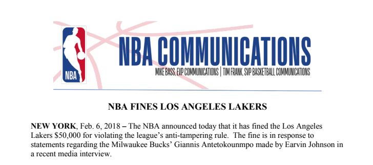 Όμως το ΝΒΑ θεώρησε ότι ο «Μάτζικ» είχε παραβιάσει τον λεγόμενο anti-tampering rule, δηλαδή να εκφράζει ως στέλεχος ομάδας άποψη για παίκτη που δεσμεύεται με συμβόλαιο με άλλον οργανισμό, επεμβαίνοντας ουσιαστικά στα εσωτερικά της. Πολλώ δε μάλλον εάν και εφόσον αυτό εκλαμβάνεται ως τρόπος προσέγγισης στον παίκτη.