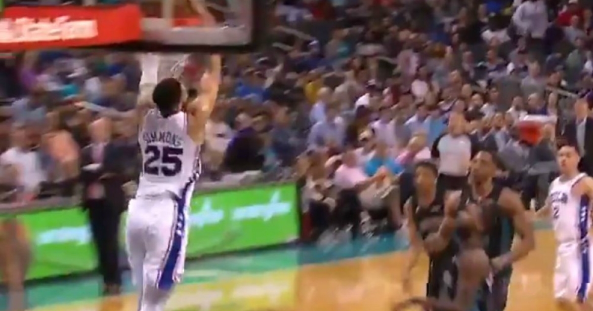 Παρόλα αυτά, ο ταλαντούχος φόργουορντ των 76ers έπιασε τη μπάλα από χαμηλά και την κάρφωσε ανάποδα στο καλάθι των Χόρνετς!