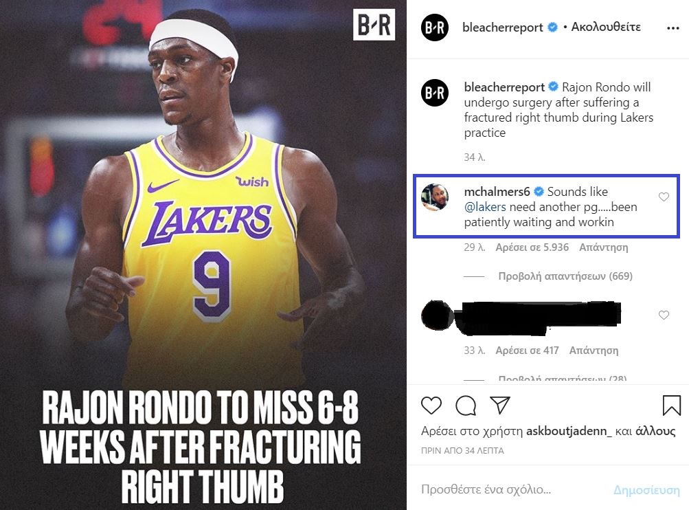 Αυτομάτως «άνοιξε» μία θέση στο ρόστερ των Λέικερς για τη θέση του πλέι μέικερ και ένας από τους παίκτες που έσπευσαν να δηλώσουν... υποψηφιότητα ήταν και ο Μάριο Τσάλμερς!