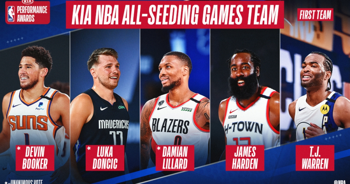 The Kia NBA All-Seeding Games First Team!@DevinBook (unanimous)@luka7doncic (unanimous)@Dame_Lillard (unanimous)@JHarden13@TonyWarrenJr pic.twitter.com/Y8gVr2iYTv