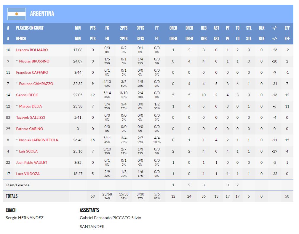 Για τους νικητές, ο Πάτι Μιλς είχε 18 πόντους με 4/11 δίποντα, 3/4 τρίποντα, ο Τζοκ Λαντέιλ πρόσθεσε 12 πόντους, 7 ριμπάουντ και 5 ασίστ ενώ σε ό,τι αφορά την Αργεντινή, ο Νίκο Λαπροβίτολα ηγήθηκε επιθετικά με 16 πόντους και ο Λουίς Σκόλα αποχαιρέτησε την εθνική ομάδα της πατρίδας του με 7 πόντους (2/7 δίποντα, 1/3 τρίποντα), 4 ριμπάουντ και 1 κλέψιμο στα 25:16 που έμεινε στο παρκέ.