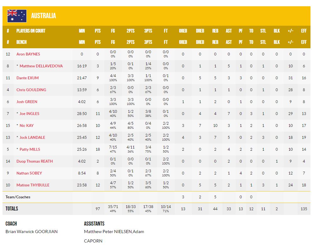 Οι Boomers έγιναν η τελευταία εθνική ομάδα που προκρίθηκε στην ημιτελική φάση του Ολυμπιακού τουρνουά μπάσκετ και μάλιστα με τον πλέον εμφατικό τρόπο, δίχως να αφήσει περιθώριο αμφισβήτησης στην Αργεντινή. Πάντως το highlight του αγώνα ήταν το παρατεταμένο standing ovation από συμπαίκτες και αντιπάλους στον τεράστιο Λουίς Σκόλα λίγο πριν από το φινάλε, στο τελευταίο ματς της σπουδαίας καριέρας του με την αγαπημένη του εθνική Αργεντινής.