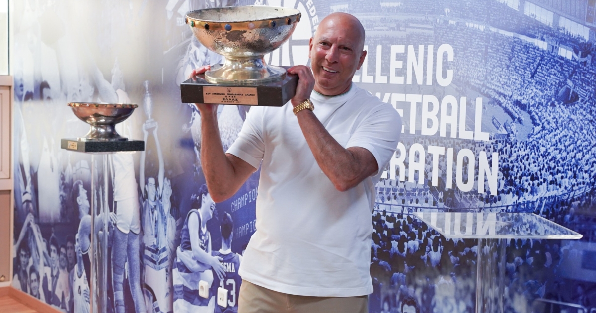 Ως μέρος της ξενάγησης, ο Γκάλης σήκωσε για άλλη μία φορά το τρόπαιο που κατέκτησε η Εθνική ομάδα στο EuroBasket 1987.