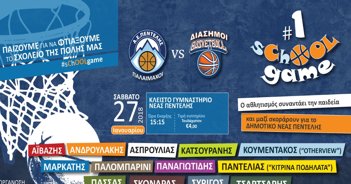 Tο “1ο sChOOL game” είναι γεγονός! Η ομάδα της Α.Ε. Πεντέλης διοργανώνει ένα φιλικό παιχνίδι διαφορετικό από τα άλλα. Το Σάββατο 27 Ιανουαρίου και ώρα 15.15 στο Κλειστό Γυμναστήριο Νέας Πεντέλης οι παλαίμαχοι της πόλης θα αντιμετωπίσουν μία επίλεκτη ομάδα διάσημων απ' όλους τους χώρους με στόχο να παίξουν, να διασκεδάσουν και από κοινού να... σκοράρουν για να υλοποιηθούν κάποιες απαραίτητες εργασίες ανακατασκευής στο Δημοτικό Σχολείο Νέας Πεντέλης.