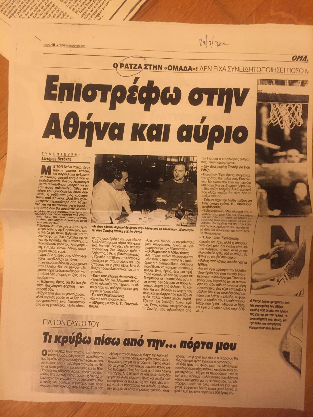 Για να μην μακρηγορώ κι άλλο, την καλύτερη συνέντευξη της ζωής μου την πήρα από το «βατραχοπέδιλο» (όπως τον έλεγαν μικρό οι φίλοι του, επειδή είχε μεγάλες πατούσες) εν πτήσει προς την Ιερουσαλήμ όπου ο Ολυμπιακός αντιμετώπιζε τη Χάποελ και δημοσιεύθηκε σε δυο δισέλιδες συνέχειες στην εφημερίδα «Το Βήμα» στις 20 και στις Ιανουαρίου του 2001.