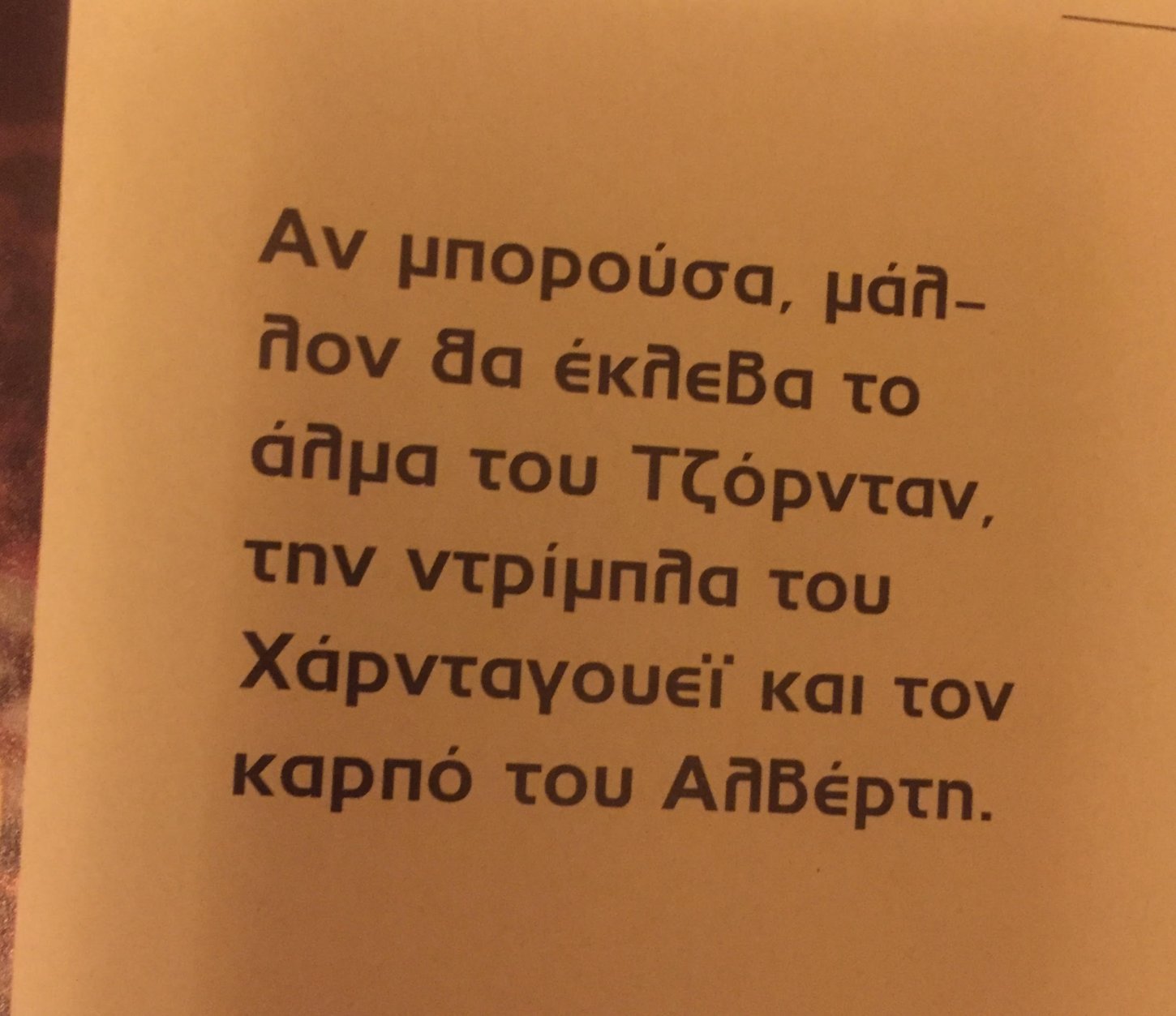Κι όλα αυτά γιατί; «Διότι δεν είμαι ούτε ζώο, ούτε ρομπότ, αλλά άνθρωπος με πάθη και αισθήματα. Ούτε θα φύγω, ούτε θα δειλιάσω, ούτε θα κρυφτώ. Θα μείνω εδώ στις επάλξεις μου και θα ζήσω ή θα πεθάνω μαζί με την ομάδα».