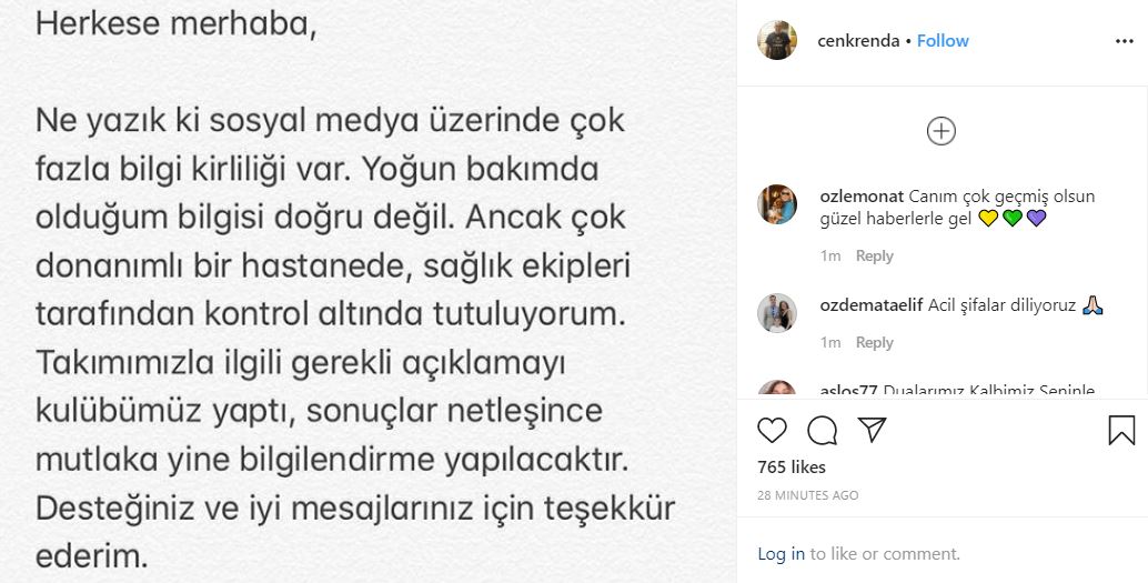 «Δυστυχώς, υπάρχει πολλή παραπληροφόρηση στα social media. Δεν είναι αλήθεια πως είμαι στην εντατική», έγραψε αρχικά ο Τσενκ Ρέντα, και συνέχισε: «Ωστόσο, είμαι σε ένα πολύ καλά εξοπλισμένο νοσοκομείο, υπό ιατροφαρμακευτική περίθαλψη. Η ομάδα έδωσε την απαραίτητη εξήγηση και τα αποτέλεσματα θα κοινοποιηθούν, μόλις είναι ξεκάθαρα. Σας ευχαριστώ για την υποστήριξη και τα καλά μηνύματα».