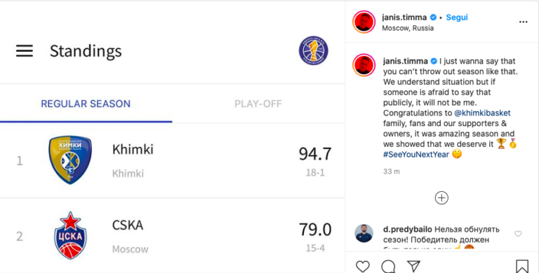Ο Γιάνις Τίμα με ανάρτησή του ανέφερε, «δεν γίνεται έτσι απλά να πετάς τη σεζόν με αυτόν τον τρόπο. Κατανοώ την κατάσταση, αλλά δεν φοβάμαι να πω την γνώμη μου δημοσίως. Συγχαρητήρια στη Χίμκι, στους φιλάθλους και στην διοίκηση για μία εξαιρετική σεζόν. Δείξαμε τι αξίζουμε».