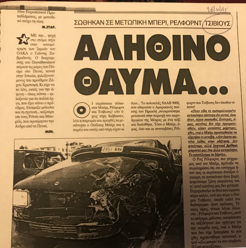 Στις 12 Μαρτίου του ’95 στη Νέα Σμύρνη (Πανιώνιος-Αρης) παρίστανε τον σωματοφύλακα του Γουόλτερ Μπέρι ενώ μετά από σαράντα μέρες οι δυο τους μαζί με τον Ριτς Ρέλφορντ κόντεψαν να σκοτωθούν σε ένα σοβαρό τροχαίο ατύχημα στη Θεσσαλονίκη.