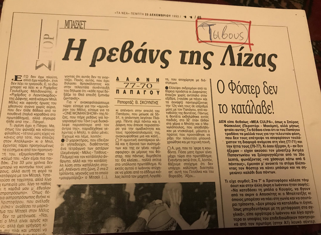Στις 22 Δεκεμβρίου του 1993 στη διάρκεια του ντέρμπι με τον Παπάγου έκλεινε το μάτι και έκανε τις γνωστές γκριμάτσες στη γκόμενα του Tοντ Μίτσελ, ονόματι Λίζα. Θυμάμαι ότι είχα ρωτήσει τότε τον πρώην παίκτη του Ολυμπιακού και τότε του Παπάγου πώς και δεν παρεξηγήθηκε και μου απάντησε ότι «α, το κάνει συνεχώς αυτό για να υπενθυμίσει στη Λίζα ότι είναι εργένης, δεν ξέρει να μαγειρεύει και θα έρθει το βράδυ στο σπίτι μας για να φάει»! Εργένης, απάντρευτος, αλλά και με τέσσερα παιδιά σπαρμένα στην Αμερική εκείνη την εποχή!
