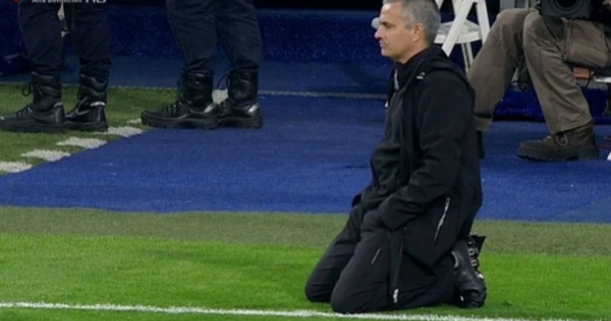 Γονάτισε κυριολεκτικά από το άγχος ο Μουρίνιο και έπεσε στο γρασίδι για να παρακολουθήσει τις τελευταίες στιγμές του αγώνα, στην διαδικασία των πέναλτι. Μάλιστα, σε μία από τις εκτελέσεις δεν κοιτούσε καν προς το τέρμα και ο Πορτογάλος προπονητής προσπαθούσε να καταλάβει τι γινόταν από τις αντιδράσεις των φιλάθλων.