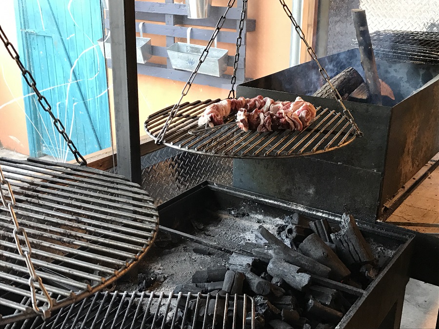 Η ανοιχτή κουζίνα βρίσκεται στα αριστερά της εισόδου και προσφέρει ιδιαίτερη θέα (και από τη σάλα και από την αυλή) στον πάγκο του χασάπη και στις ψησταριές.