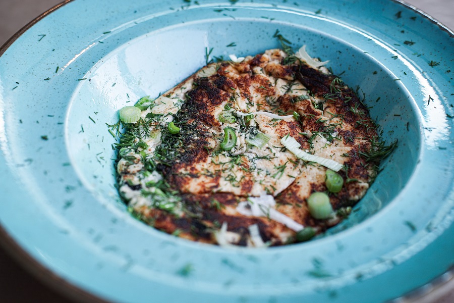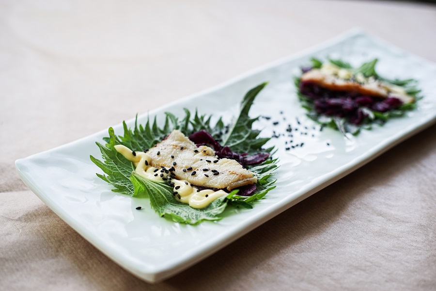 Βουτυρόψαρο καπνιστό πάνω σε σίσο με ξινολαχανο,μαγιονεζα και μαυρο σουσάμι: Μια από τις σπεσιαλιτέ του σεφ