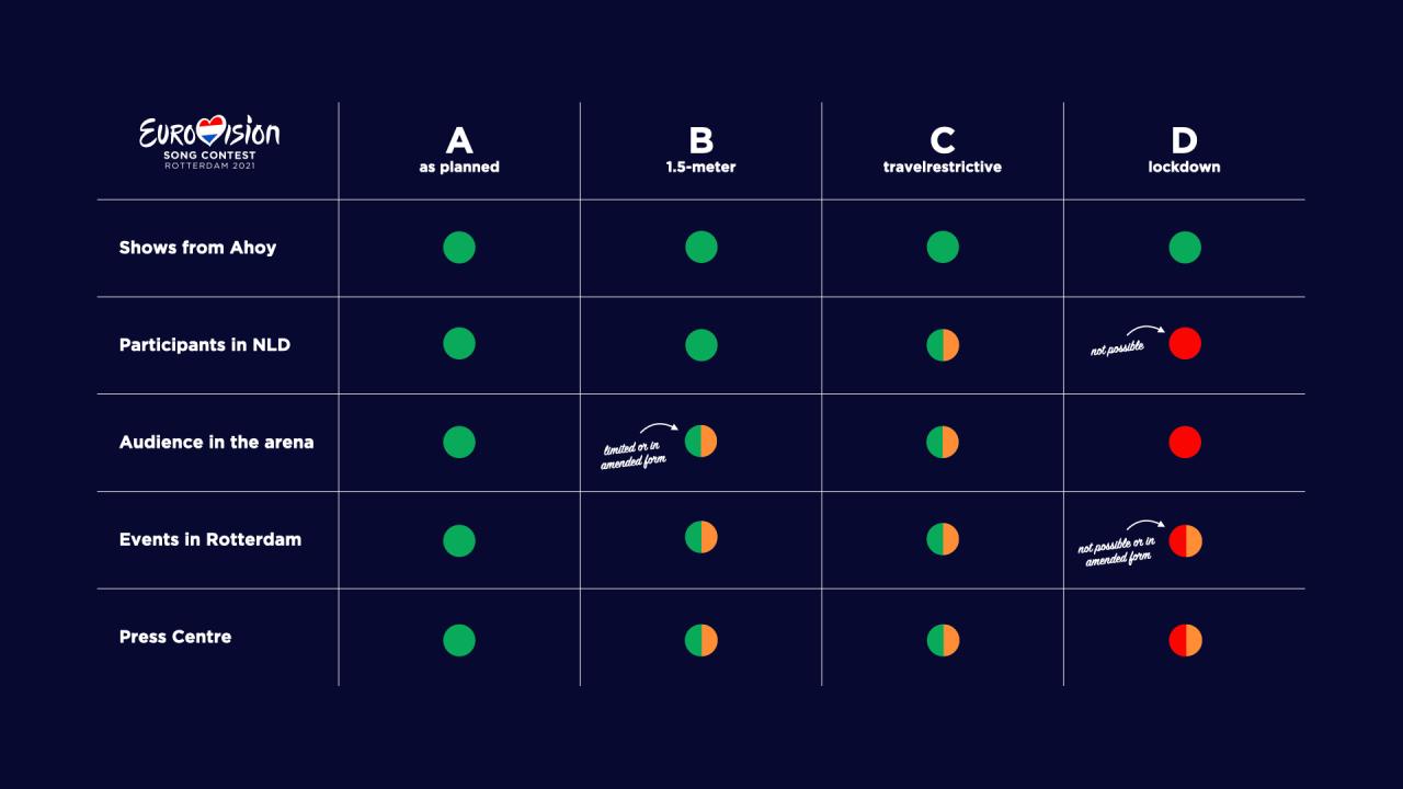 Εάν υπάρξει πάλι περίπτωση lockdown, τότε ο διαγωνισμός τραγιουδιού θα γίνει, αλλά χωρίς κοινό και δραστηριότητες. Κάθε καλλιτέχνης θα παρουσιάσει το κομμάτι του από την χώρα του και οι εικόνες θα μεταδίδονται από την «Ahoy Arena» (το ίδιο θα γίνει και με τον διαγωνισμό της Junior Eurovision τον Νοέμβριο).