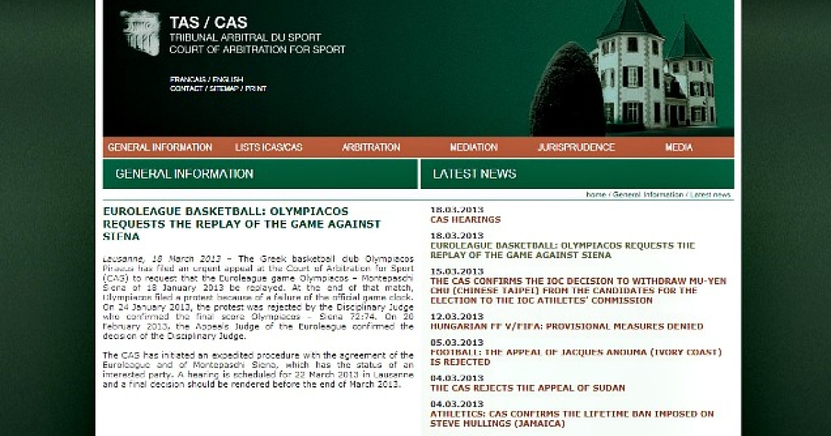 «Η ελληνική ομάδα Ολυμπιακός Πειραιώς άσκησε επείγουσα έφεση στο CAS, ζητώντας η αναμέτρηση της Ευρωλίγκας Ολυμπιακός-Σιένα της 18ης Ιανουαρίου 2013 να επαναληφθεί. Με τη λήξη της αναμέτρησης, ο Ολυμπιακός κατέθεσε ένσταση, λόγω προβλήματος στο επίσημο χρονόμετρο. Στις 24 Ιανουαρίου 2013, η ένσταση απορρίφθηκε απ' τον Πειθαρχικό Δικαστή, ο οποίος επικύρωσε το τελικό σκορ Ολυμπιακός-Σιένα 72-74. Στις 20 Φεβρουαρίου 2013, το Εφετείο της Ευρωλίγκας επικύρωσε την απόφαση του Πειθαρχικού Δικαστή.