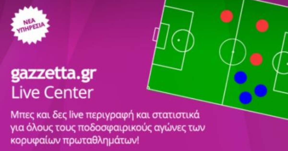 Η μεγαλύτερη και πιο ζωντανή βάση δεδομένων αγώνων ποδοσφαίρου προσγειώθηκε στο γήπεδο του gazzetta! Ενα κορυφαίο εργαλείο τελευταίας τεχνολογίας σας δίνει πλέον την δυνατότητα να παρακολουθείτε μέσα από το gazzetta με πλήρη, ζωντανή κάλυψη, οποιονδήποτε αγώνα του ελληνικού, αλλά και του αγγλικού, του ισπανικού και του ιταλικού πρωταθλήματος, αλλά και του Champions League και του Europa League!