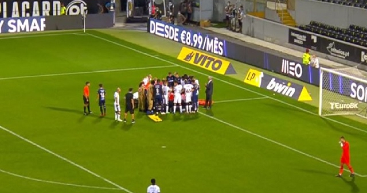 O jogador do Vitória SC saiu de maca após um choque de cabeças que o deixou inanimado. pic.twitter.com/BqxpidoOKa