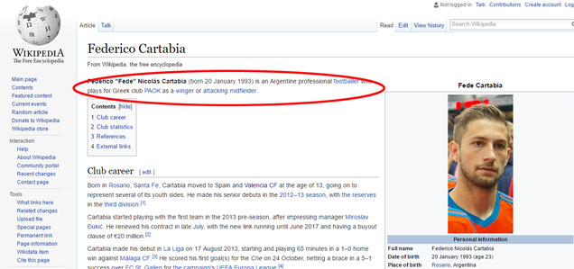 Πάντως, στην αγγλική έκδοση της Wikipedia κάποιοι φίλοι του ΠΑΟΚ πρόλαβαν και τον «βάπτισαν» ποδοσφαιριστή του «Δικεφάλου»!