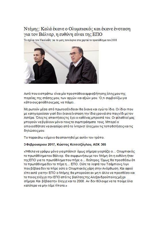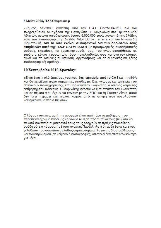 «Το ότι θα μιλούσα γι' αυτή την υπόθεση και θα υπήρχε φίλαθλος της ΑΕΚ που θα περνούσε από το μυαλό του ότι με αυτά που είπα αθωώνω τον Ολυμπιακό ή ότι λέγοντας "...καλά έκανε...» εννοώ ότι και εγώ το ίδιο θα έκανα, ξεπερνούσε τη φαντασία μου», αναφέρει χαρακτηριστικά ο πρώην σέντερ φορ της ΑΕΚ, ο οποίος ανέβασε στη σελίδα του στο Facebook τα παρακάτω κείμενα, με αφορμή κάποιες ερμηνείες που δόθηκαν σε όσα είπε στην ραδιοφωνική του εκπομπή.