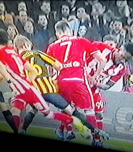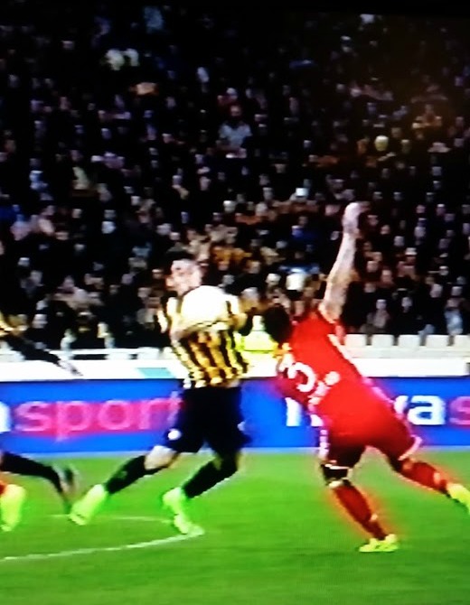 Κι επειδή λέμε ότι ο Ολυμπιακός δεν έκανε καθαρές φάσεις για γκολ, η ΑΕΚ τι έκανε; Σε όλο το ματς είχε δύο ευκαιρίες, με τον Αραούχο-κάλπικες κι οι δύο. Η μία ένα μέτρο οφσάϊντ με τον επόπτη Ακρίβο να μην το βλέπει (!!!) και η άλλη με τον κυνηγό της ΑΕΚ αφενός μεν να σπρώχνει τον Μποτία, αφετέρου δε να κάνει κοντρόλ της μπάλας με το χέρι (δείτε τη φωτό) πριν σουτάρει και διώξει ο Λεάλι.