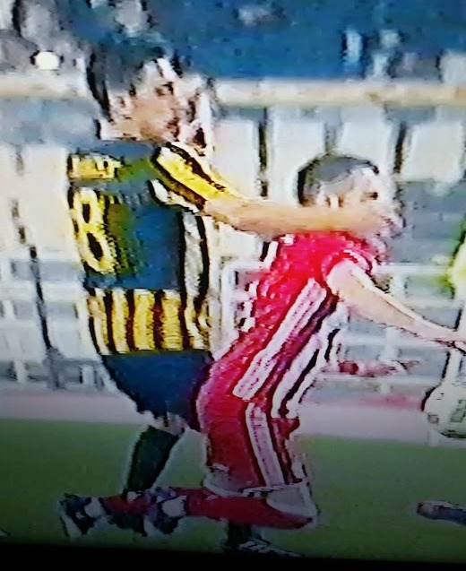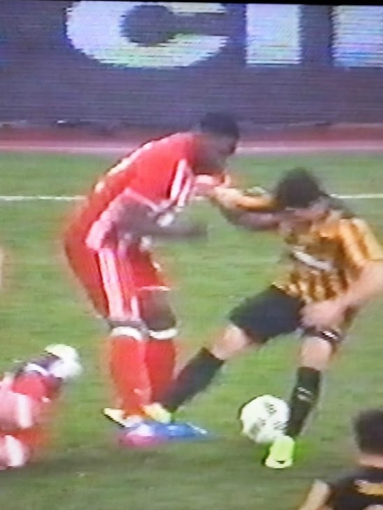 Θέλετε κι άλλο; Σύμφωνα με τα σφυρίγματα του Μάνταλου (στην πραγματικότητα ήταν πολύ περισσότερα), οι παίκτες της ΑΕΚ έκαναν 20 φάουλ. Ε, το μοναδικό φάουλ υποτίθεται κοντά στην περιοχή του Μπάρκα είναι αυτό που βλέπετε στη φωτό: κοντά στην γραμμή του αράουτ και στα 40 μέτρα μακριά από την εστία της ΑΕΚ…