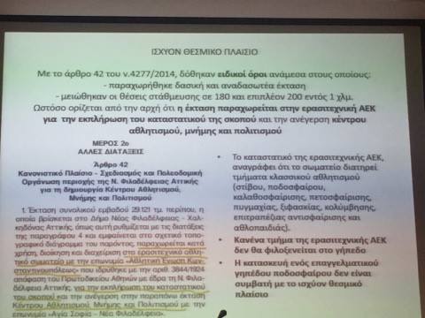 «Η προπαγάνδα, η ψευδολογία και η συκοφαντία στο πρόσωπό μου έχει φτάσει στα όρια της πολιτικής δολοφονίας. Έχω χαρακτηριστεί βαμμένος Ολυμπιακός, γαύρος, άνθρωπος του Μαρινάκη τη στιγμή που έχω πάρει θέση, τη στιγμή που ξέρουν πως ποτέ δεν είχα σχέση με το ποδόσφαιρο. Λένε ότι δήθεν θέλω να κάνω πολιτική καριέρα κόντρα στο όνειρο της ΑΕΚ. Οι συμπολίτες γνωρίζουν τις προσπάθειες για να αλλάξει πρόσωπο η πόλη μας. Τη μέρα των εκλογών του 2014 είχαμε το αλησμόνητο Χ στο πρόσωπό μου από οπαδικό έντυπο. Τι λέγαμε προεκλογικά; Η ιστορία του γηπέδου εμφανίστηκε το Σεπτέμβριο του 2013. Το δημοτικό συμβούλιο κλήθηκε να ψηφίσει ‘ναι’ για το γήπεδο. Ψηφίστηκε η έγκριση προμελέτης του γηπέδου και μελέτης υπογειοποίησης σε ένα συμβούλιο που σημαδεύτηκε από τραμπουκισμούς. Στην προεκλογική περίοδο του 2014 διαφωνήσαμε ανοιχτά με το ρυθμιστικό σχέδιο και εκφράσαμε τις θέσεις μας. Λέγαμε και λέμε ‘ναι’ στον ιστορικό χώρο της ΑΕΚ, αλλά όχι με συρρίκνωση στον πράσινο χώρο, διαφωνήσαμε με την παραχώρηση χώρου σε εταιρεία ιδιωτικού δικαίου και ζητούσαμε τροποποίηση του ύψους του γηπέδου. Το επιχείρημα ότι το γήπεδο ήταν πάντα εκεί είναι εν μέρει σωστό. Τώρα είναι στο κέντρου του ιστού της πόλης μας. Ζητήσαμε επαρκή χώρο στάθμευσης για να μην υπάρχει κομφούζιο στις μέρες των αγώνων. Η μεθοδικά καλλιεργημένη εικόνα της φτωχής ψωροκώσταινας Νέας Φιλαδέλφειας που έχει μαραζώσει είναι ψευδής. Ζητήσαμε κι ακόμη ζητάμε τη στέγαση των ερασιτεχνικών τμημάτων. Ζητήσαμε από το 2010 τη μεταφορά του σταθμού μεταφόρτωσης και του αμαξοστασίου μακριά από το γήπεδο κι έχουμε καταθέσει ολοκληρωμένο φάκελο χρηματοδότησης στο ΕΣΠΑ».