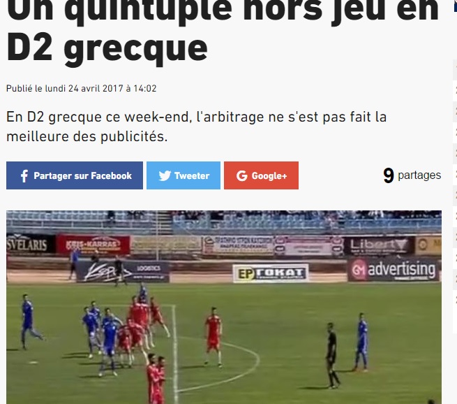 Η γαλλική εφημερίδα έχει θέμα το γκολ του Μπουλούλη και αναφέρει ότι υπήρχε πενταπλό οφσάιντ σε παιχνίδι της 2ης κατηγορίας της Ελλάδα, ενώ στη συνέχεια τονίζει χαρακτηριστικά: «Δεν ήταν και η καλύτερη διαφήμιση για την διαιτησία».