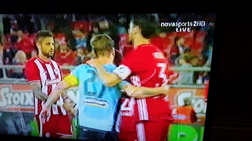 Οκτώ. Όλοι οι ποδοσφαιριστές του Πλατανιά έφυγαν από το παιχνίδι αγκαλιά με τους παίκτες του Ολυμπιακού, όπως π.χ. στη φωτό ο αρχηγός Βάντερσον με τον Μποτία. Μετά από…ξύλο στο ημίχρονο, οι παίκτες που το έφαγαν το ξύλο, θα έφευγαν…αγκαλιά με τους αντιπάλους τους;…