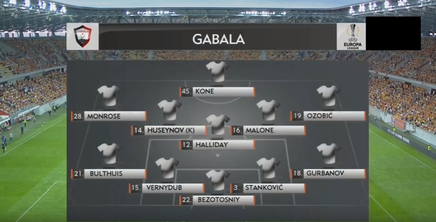 Ο Μπερεζούσκι έχοντας να ανατρέψει το 1-1 του πρώτου ματς στο Μπακού, παρέταξε την Καμπάλα με 4-3-3. Ο Μπεζοτόσνι υπερασπίστηκε την εστία των Αζέρων. Αριστερό μπακ ξεκίνησε ο Μπουλτούις, δεξί ο Κουρμπάνοφ και στο κέντρο της άμυνας ο Στάνκοβιτς με τον Βέρνιντουμπ. Ο Χάλινταϊ σε ρόλο αμυντικού μέσου, έχοντας εσωτερικούς μέσους τον Χουσεϊνοφ από αριστερά και τον Μαλόνε από δεξιά. Αριστερό «φτερό» ο Μονρόζ, δεξί ο Όζομπιτς και στην κορυφή ο Κονέ.